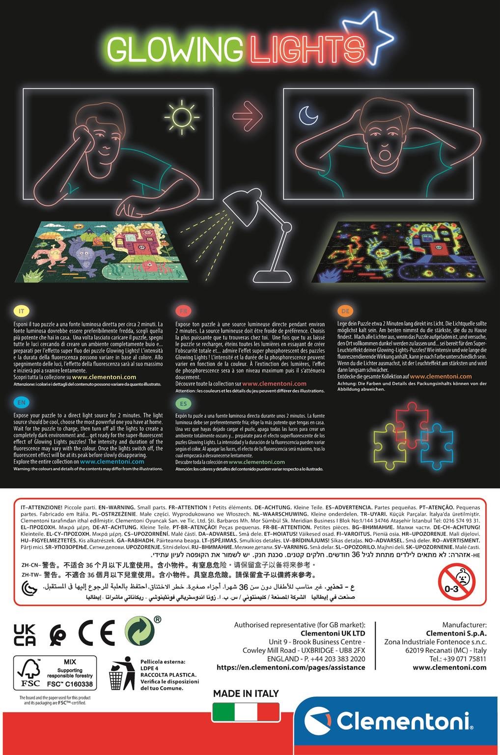 Dětské fluorescenční puzzle svítící ve tmě. Díky speciální povrchové úpravě fluorescenční barvou obrázek ve tmě trojbarevně svítí.