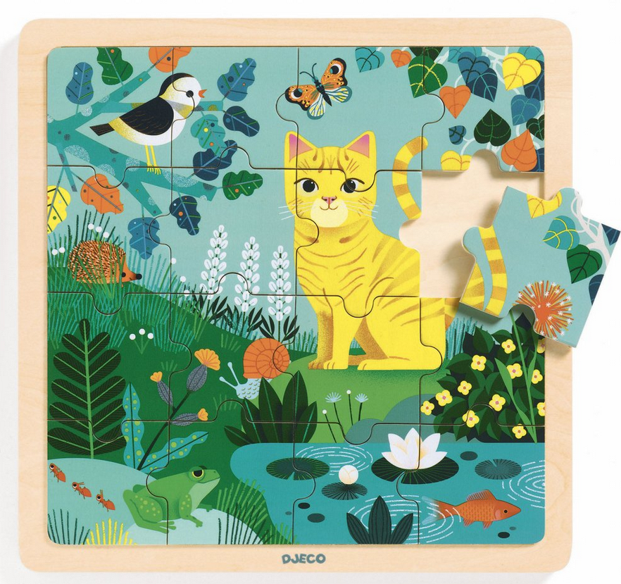 DJECO Dřevěné puzzle Kočka v zahradě, 16 dílků