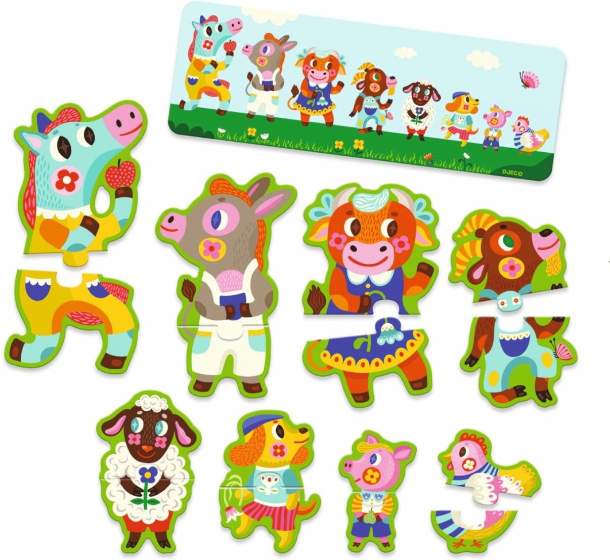 Poskládej si puzzle ve tvaru zvířátek žijících na farmě! 8 dvoudílných postaviček domácích zvířat praktická kartonová krabička s ouškem velké dílky, vhodné pro malé děti ekologické balení šetrné k životnímu prostředí