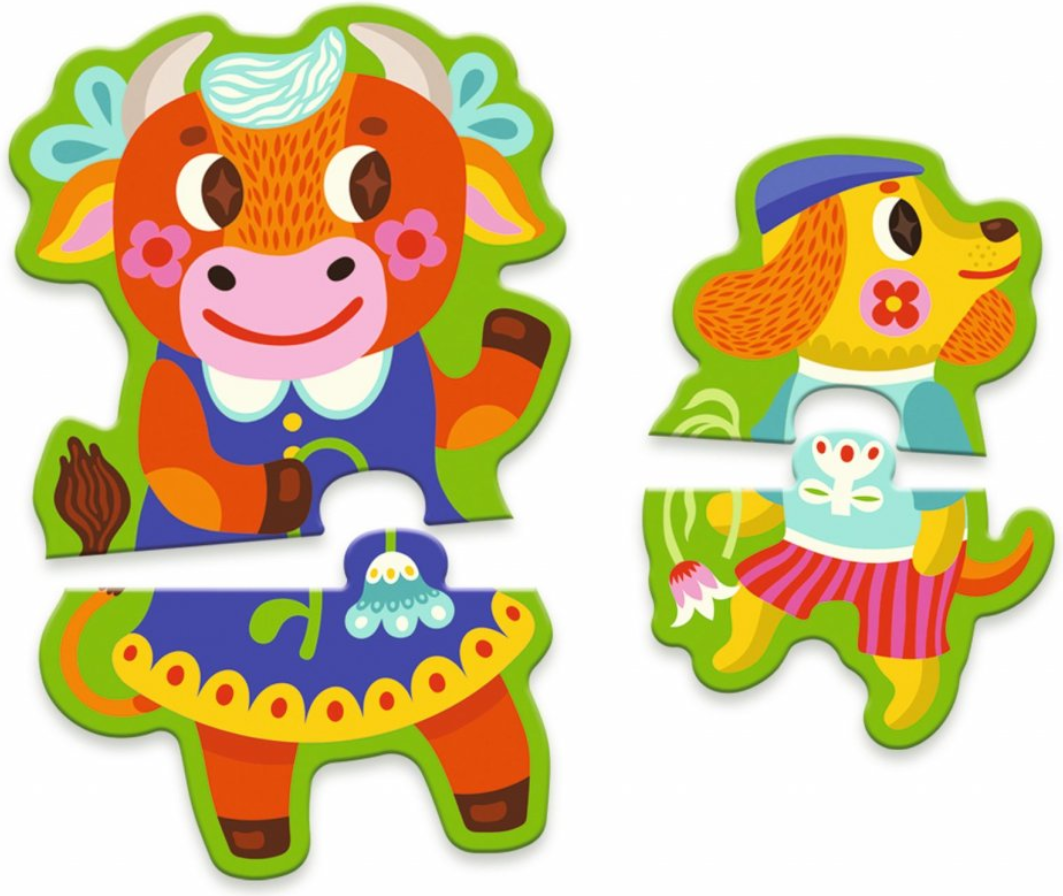 Poskládej si puzzle ve tvaru zvířátek žijících na farmě! 8 dvoudílných postaviček domácích zvířat praktická kartonová krabička s ouškem velké dílky, vhodné pro malé děti ekologické balení šetrné k životnímu prostředí