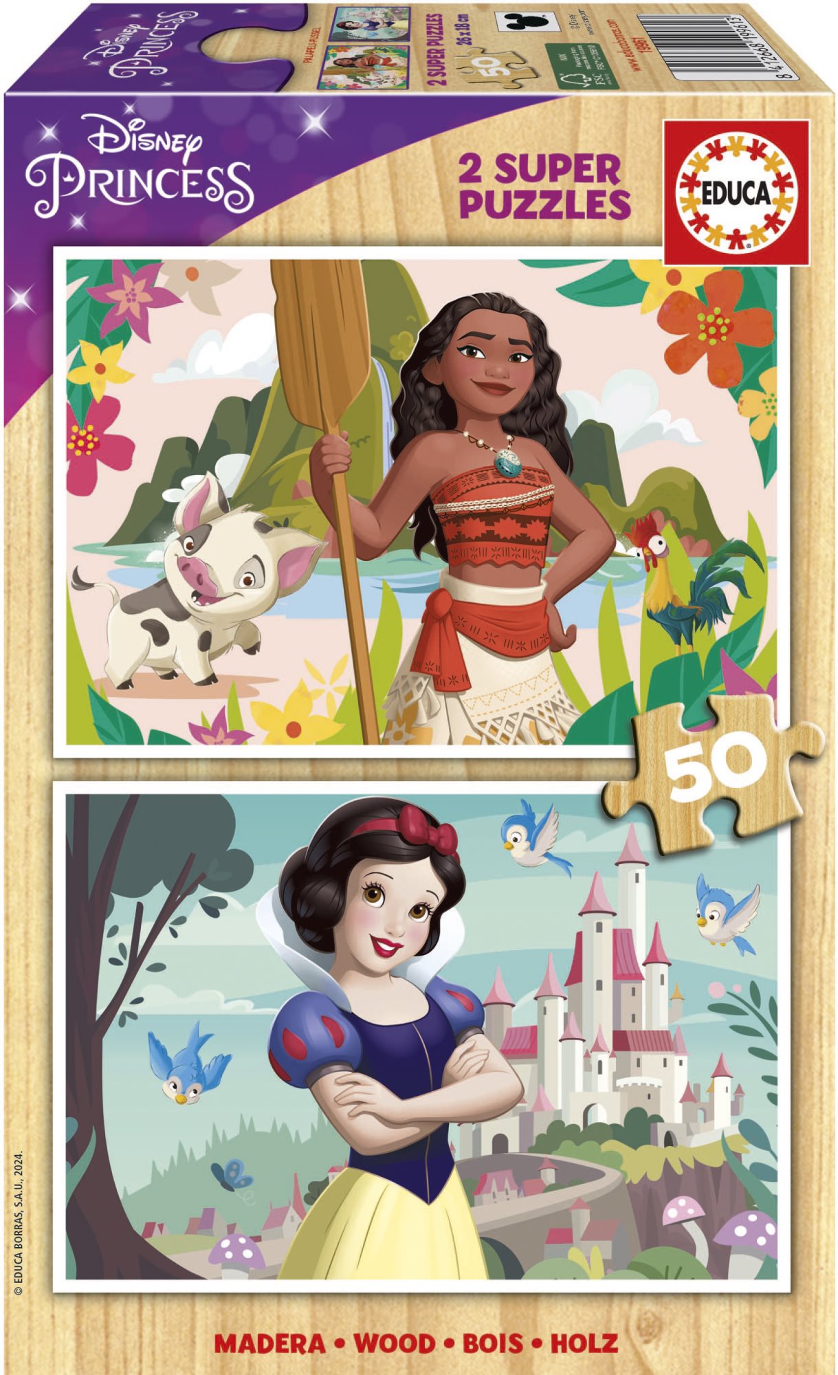 EDUCA Dřevěné puzzle Disney princezny: Vaiana a Sněhurka 2x50 dílků