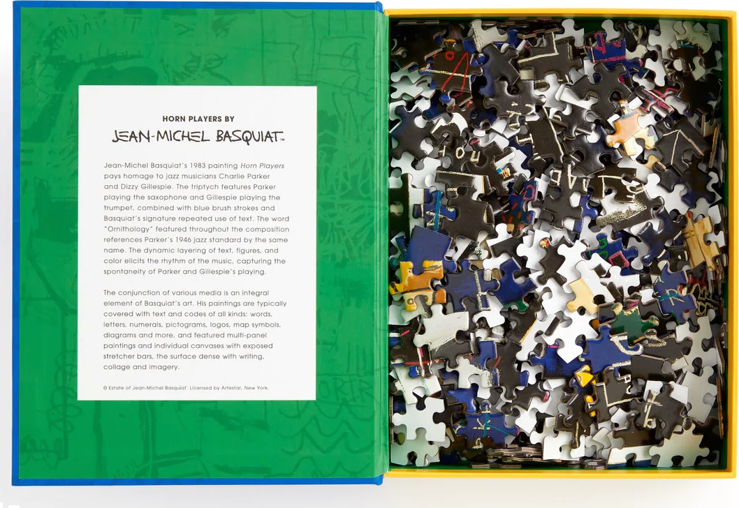 Puzzle Basquiat: Hráči na lesní roh v obalu ve tvaru knihy je obměnou klasického 500 dílného puzzle.