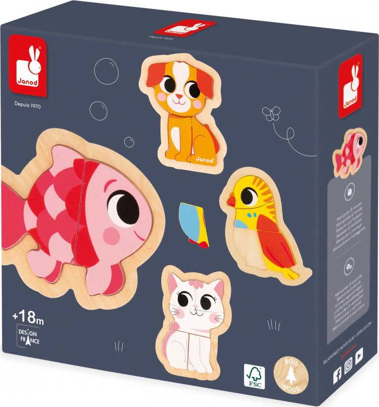 Progresivní dřevěné puzzle s různou obtížností - 4 různá puzzle zvířátek s různým počtem dílků a podkladovou deskou. Se zvyšujícím se počtem dílků se zvyšuje obtížnost skládání. 4 puzzle: ryba 2 dílky, pes 3 dílky, papoušek 4 dílky, kočka 5 dílků.