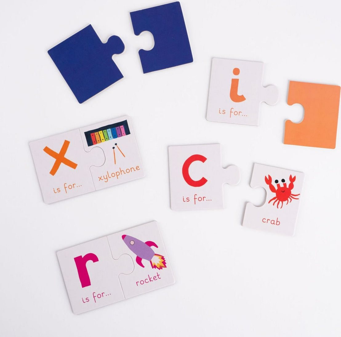 Sada obsahuje 26 samostatných dvoudílných puzzle, které podporují rozpoznávání písmen a jejich přiřazování k obrázkům a slovům (v angličtině).