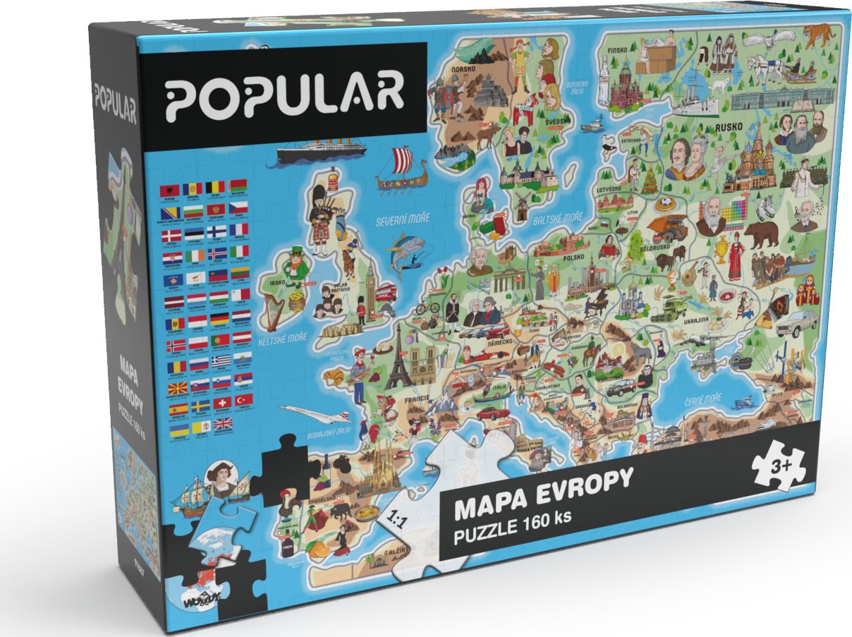 Zeměpisné puzzle pro děti s mapou Evropy a ilustracemi od výtvarnice Hany Vavřínové. Na mapě najdete obrázky charakterizující evropské země a vlajky jednotlivých států. Veškeré texty na mapě jsou uvedeny v českém jazyce.