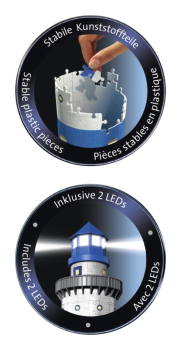 Maják s opravdovým světlem rozšiřuje řadu staveb v Noční edici. Dvě blikající LED diody dokonale simulují skutečný provoz majáku. Noční maják RAVENSBURGER zaručeně přitáhne pozornost a v noci posvítí všem opozdilcům na cestu do postele.
