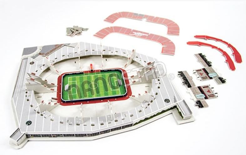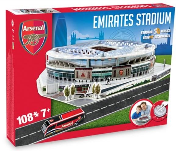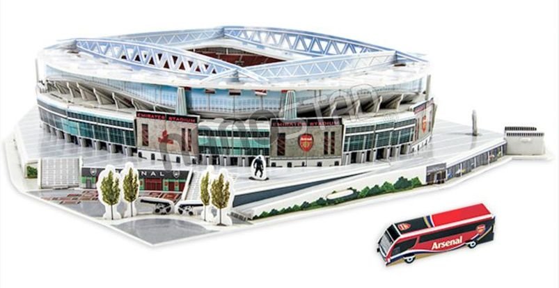 3D puzzle Fotbalový stadion Emirates - domácí hřiště klubu FC Arsenal. ke skládání nepotřebujete nůžky ani lepidlo detailní replika stadionu vyrobeno z polystyrenové pěny potažené fotopapírem ideální dárek pro všechny fotbalové fanoušky