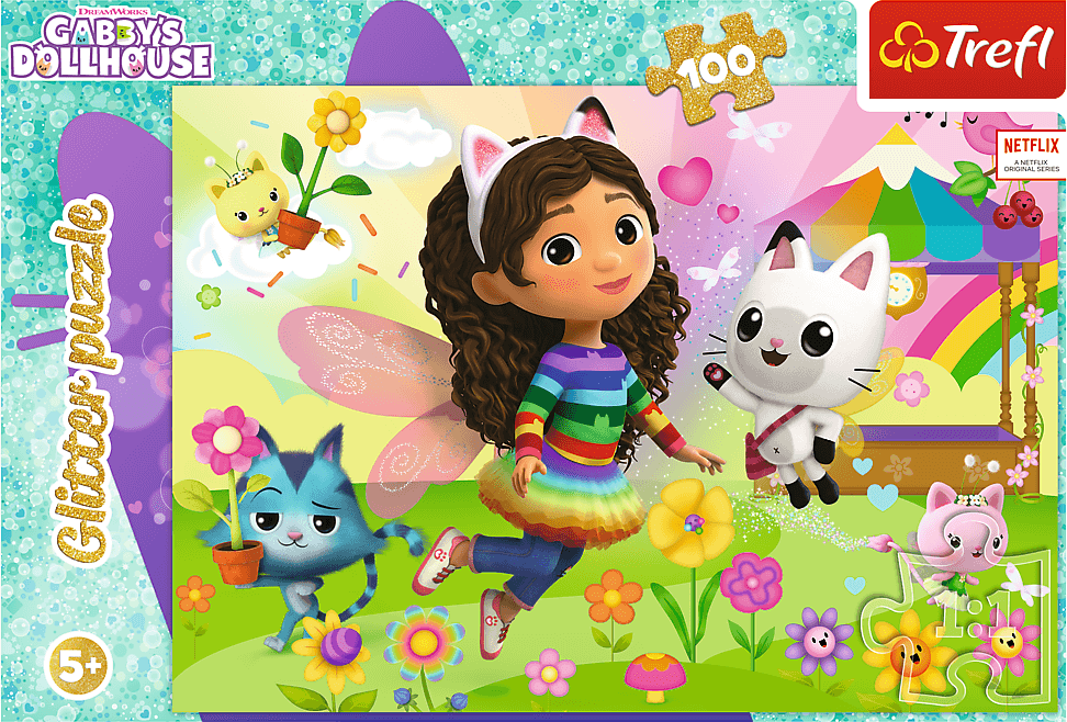 Třpytivé puzzle se 100 dílky s motivem seriálu Gábinin kouzelný domek. Glitter Puzzle je ideální hračka pro holčičky, které mají rády všechno, co se leskne a třpytí. Puzzle je zdobeno jemnými třpytkami…
